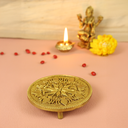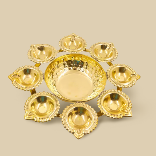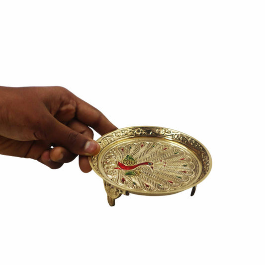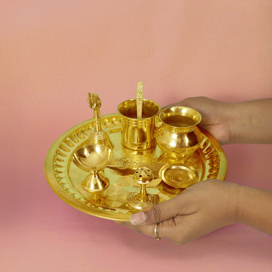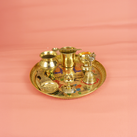 पीतल का 8 पीस मोर पूजा थाली सेट