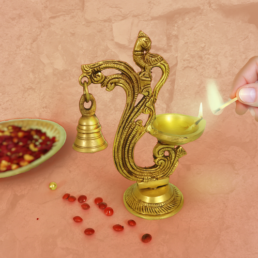पीतल का प्राचीन मोर दीया घंटी के साथ