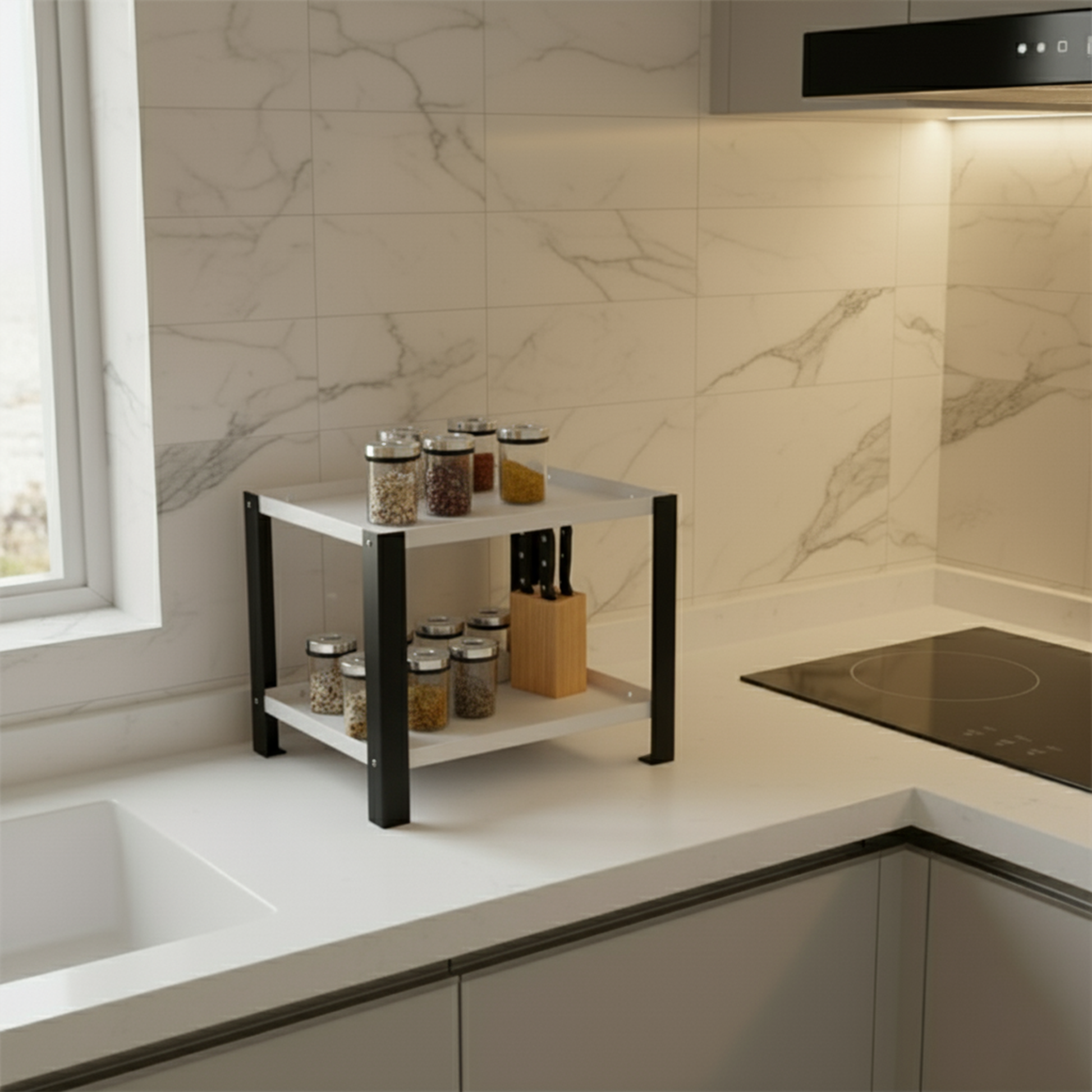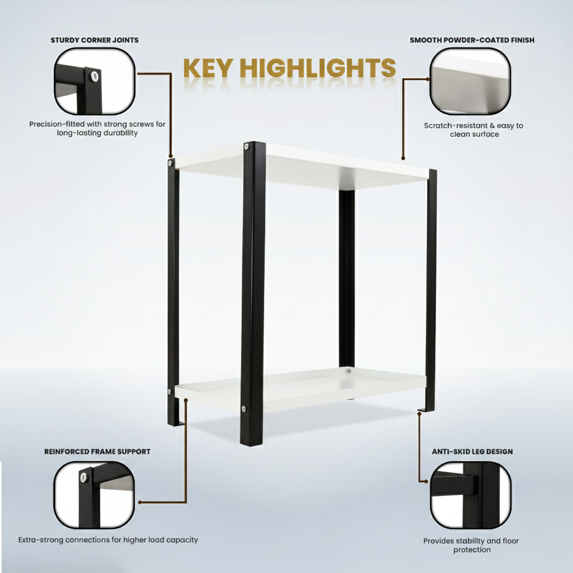 Djuize Pooja Shelf for Home Temple|Elegant Pooja Rack Design with Black Stem & white Shelves|Small Puja Shelf|Pooja Stand Design|Pooja Shelf in Living Room|Puja Room Shelves| Pooja Almirah Design-Metal 2 tier Rack shelf Black stem with white tray