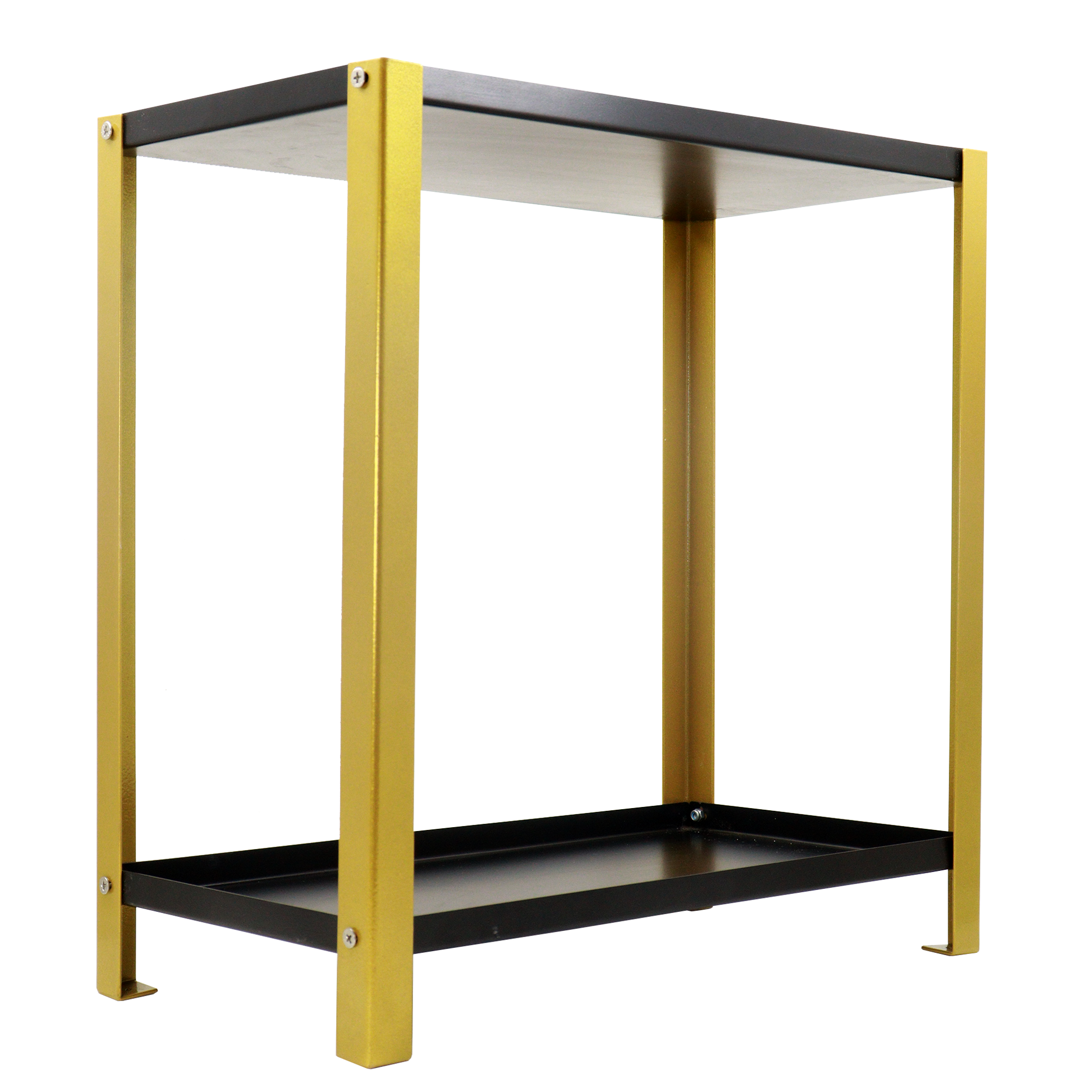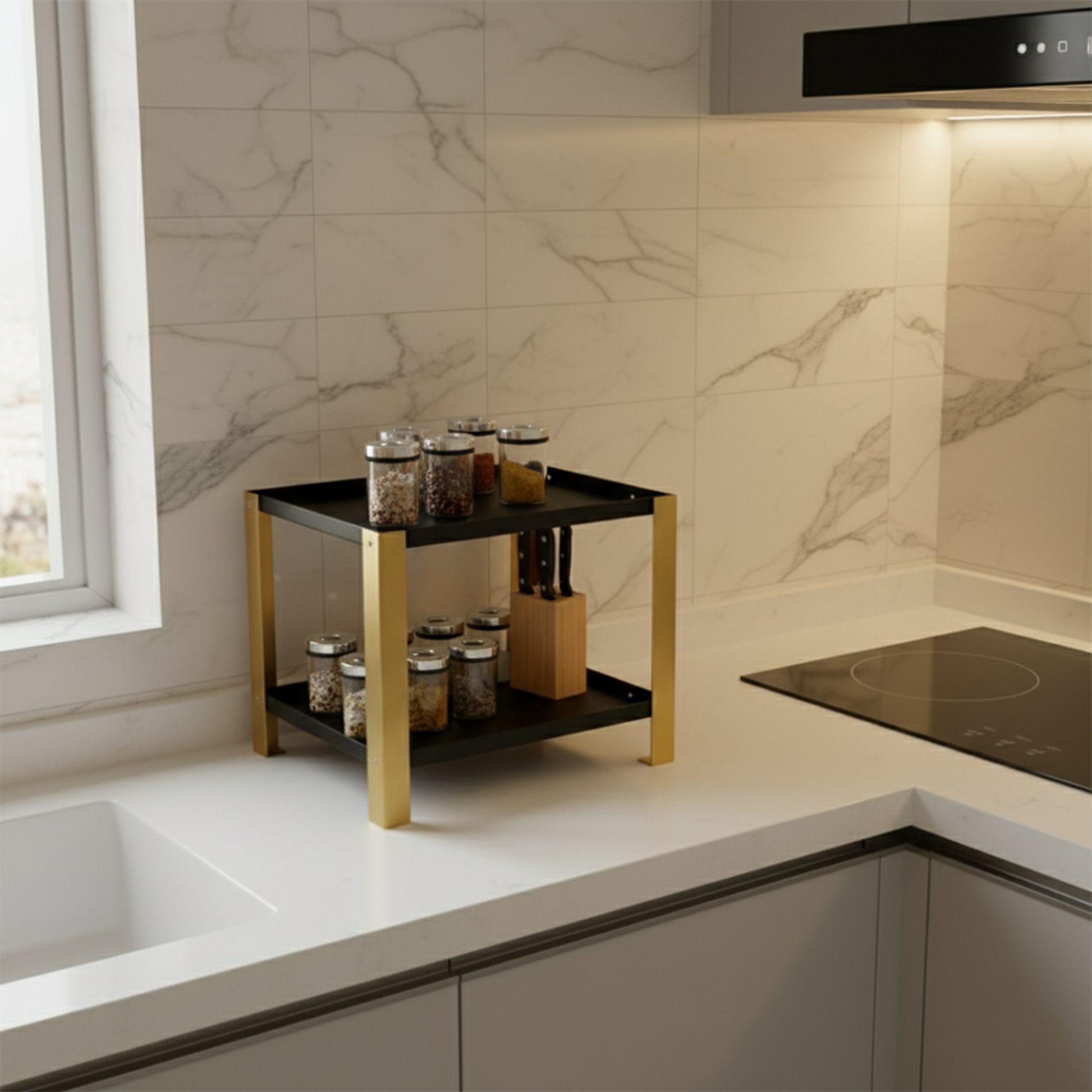 Djuize Pooja Shelf for Home Temple|Elegant Pooja Rack Design with Golden Stem& Black Shelves|Small Puja Shelf|Pooja Stand Design|Pooja Shelf in Living Room|Puja Room Shelves| Pooja Almirah Design-Metal 2 tier Rack shelf Gold stem with black