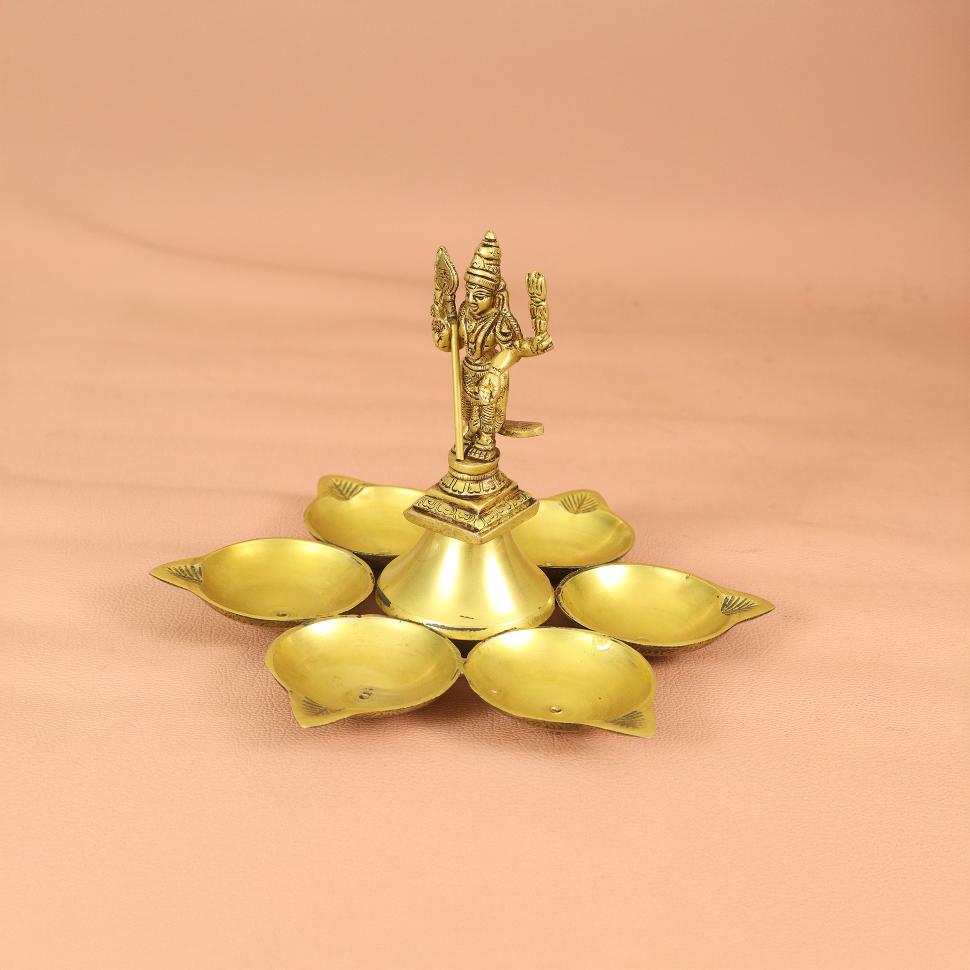 About This Item (Short Description)    A finely crafted antique brass diya featuring Lord Murugan with six lamps, reflecting traditional South Indian craftsmanship and deep spiritual symbolism.