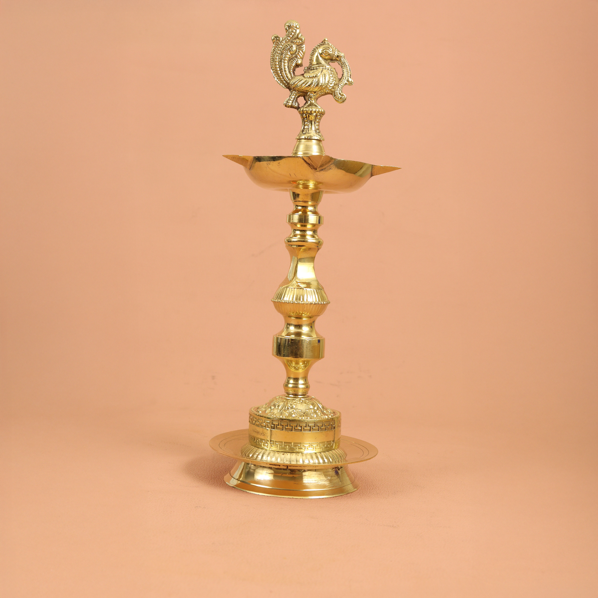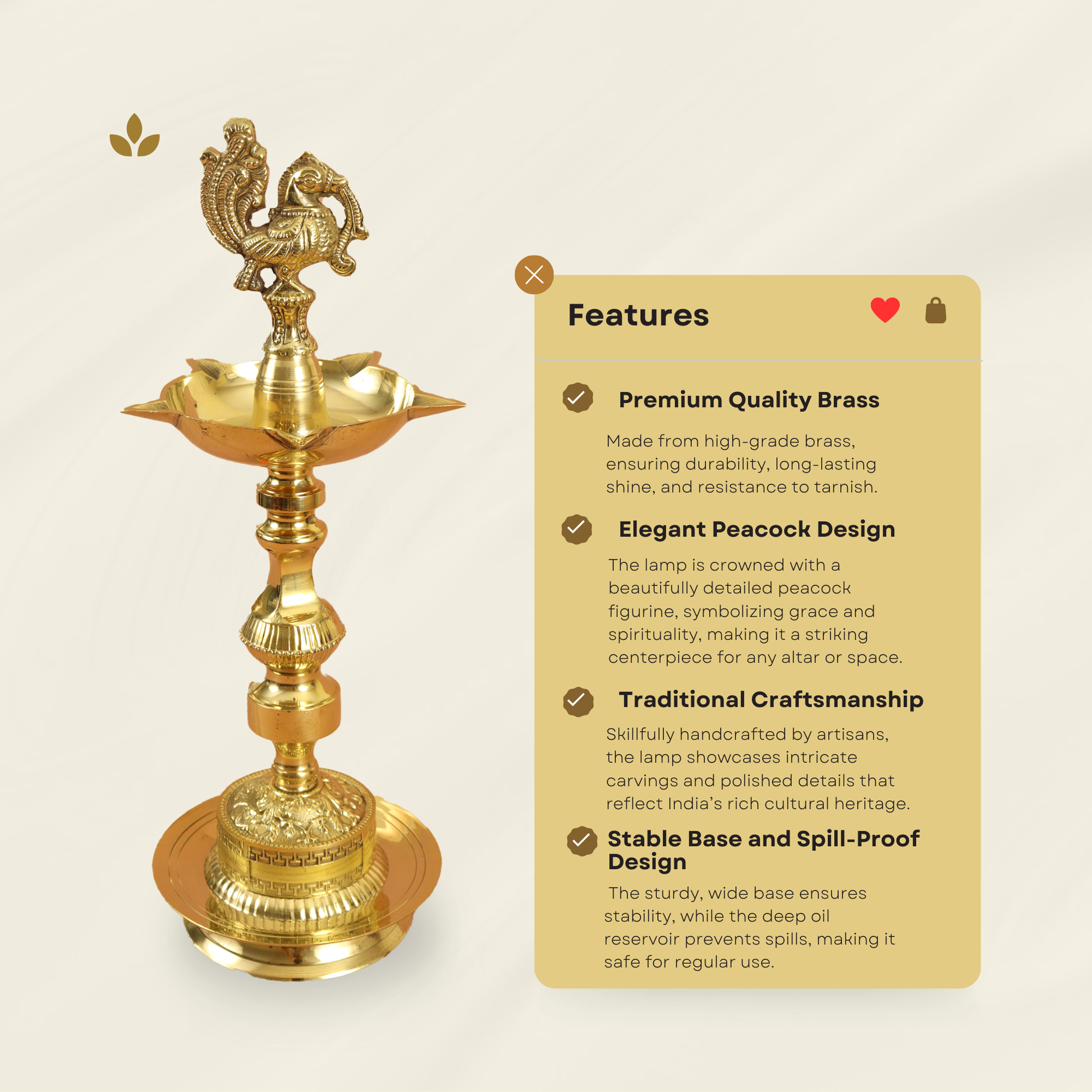 About This Item (Short Description) A beautifully designed large brass Peacock Diya featuring the sacred Annam motif, radiating elegance and devotion. Its majestic design and bright glow make it perfect for enriching your spiritual space and enhancing divine energy.