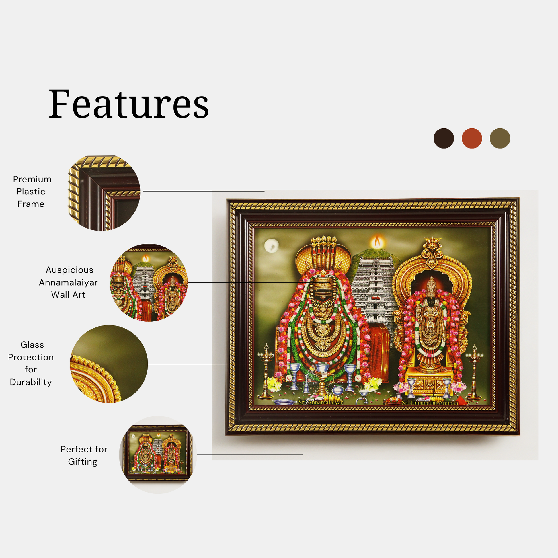 Material Quality | Made with high-quality plastic in a golden finish, lightweight yet sturdy, with a finely detailed and vibrant photo of Lord Annamalaiyar (Arunachaleswarar). |