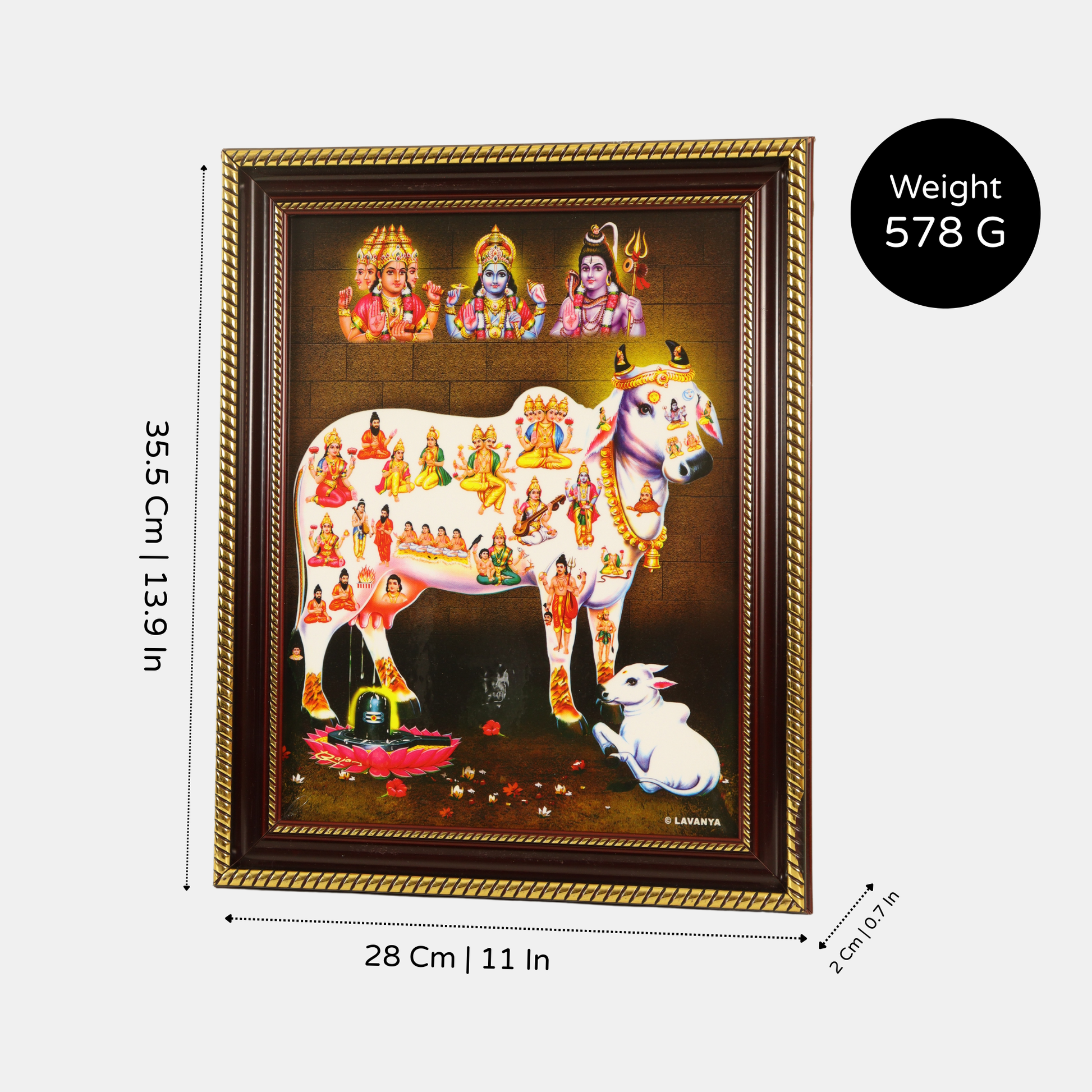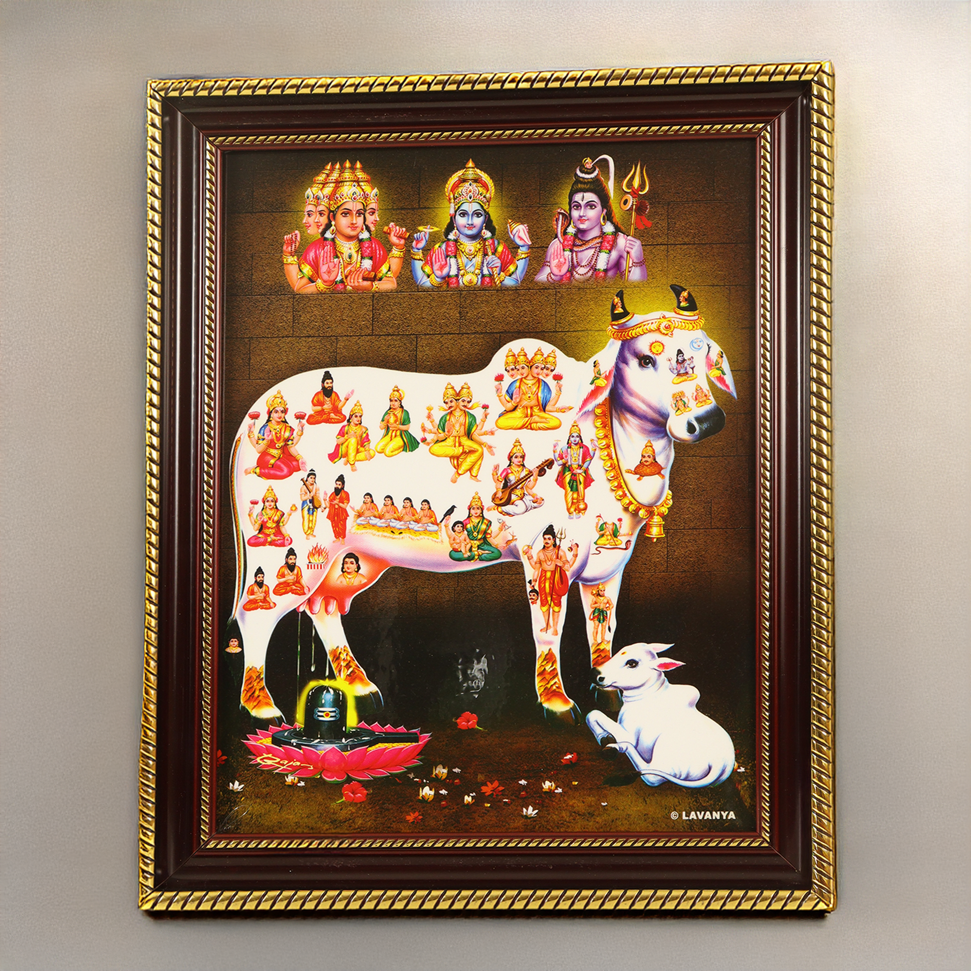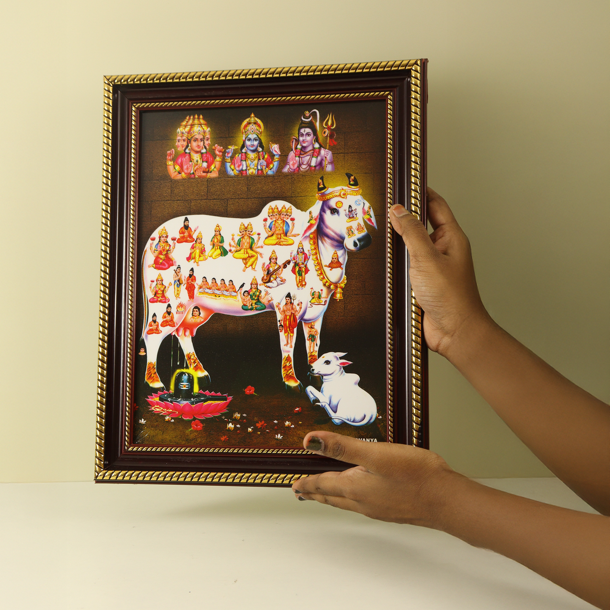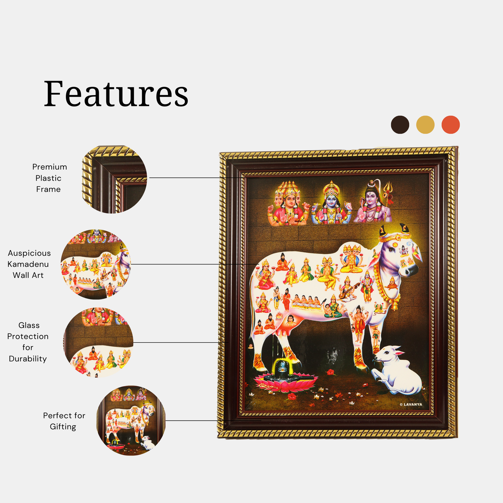 About This Item (Short Description) | A golden devotional photo frame of Kamadenu, the sacred cow, symbolizing abundance, purity, and blessings of prosperity for home and office spaces. |