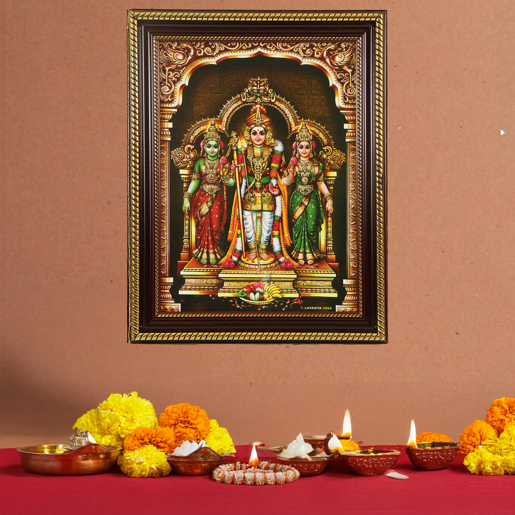 The God Photoframe of Palani Raja Murugar (Valli, Deivayanai) is a sacred and beautifully designed devotional artifact that captures the divine presence of Lord Murugar—also known as Palani Andavar—alongside his beloved consorts, Valli and Deivayanai. Lord Murugar, the revered son of Lord Shiva and Goddess Parvati, is widely worshipped in Tamil traditions as the embodiment of valor, wisdom, and spiritual victory. This photo frame is not just a religious decor item, but a symbol of deep-rooted faith and protection. When placed in a home, temple, or sacred space, it is believed to dispel negativity, energize the environment, and attract divine blessings.