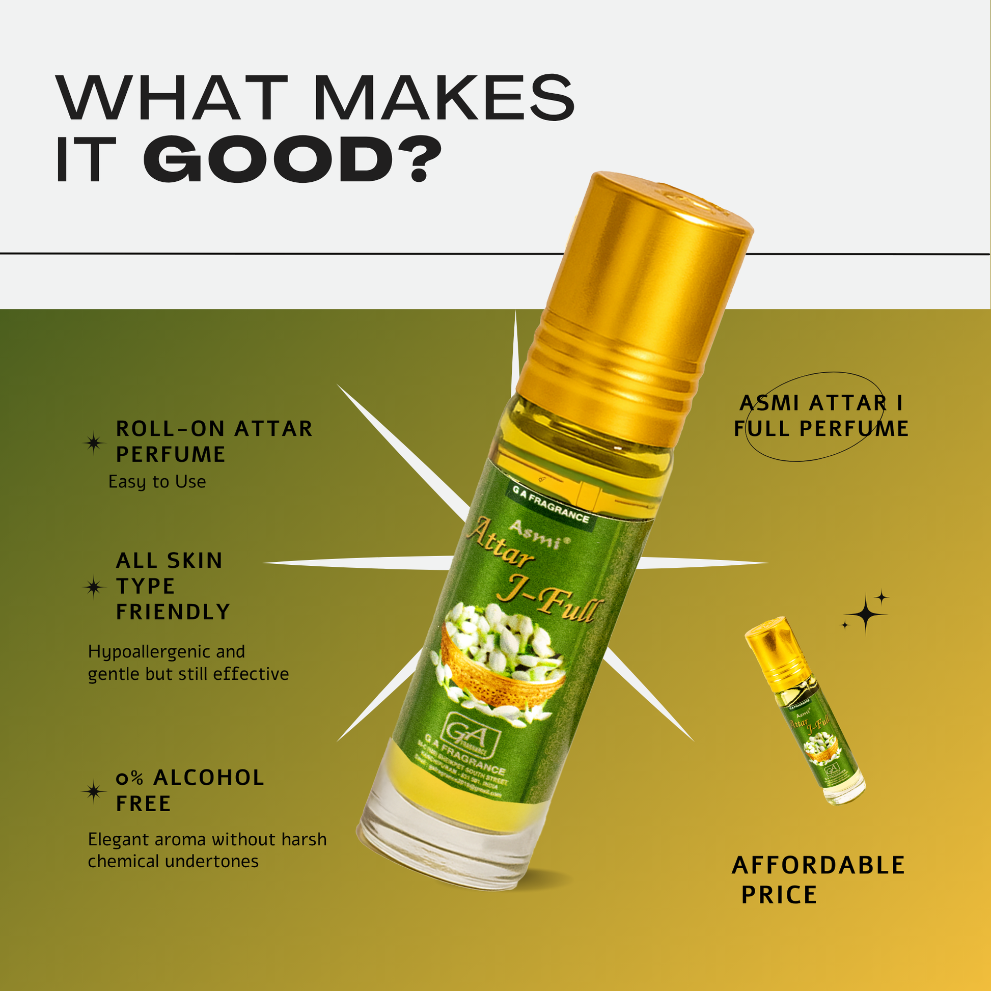 Customer Benefits | • Long-lasting natural jasmine fragrance • Alcohol-free and safe on skin • Creates a divine and peaceful atmosphere • Enhances focus and calmness during prayers and meditation • Compact roll-on design makes it travel-friendly and easy to use. |